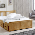 The Mission Waxed Pine Wooden Bed is a fantastic choice for those looking for a comfortable and spacious sleeping area with integrated storage. The bed's premium pine construction offers exceptional quality and durability, while the waxed pine finish enhances the stunning shaker design, complete with a slatted wooden headboard and grooved panels in the footboard crafted from plywood. The bed is available in three different sizes, making it ideal for any double or master bedroom that requires extra floor space. Underneath the bed, there are six pine drawers on double beds and three on one side of the single frame, all designed with inward-facing handles to prevent accidental collisions. The base of the drawers is made of plywood. The bed is supplied flat packed with easy-to-follow instructions for assembly. With the Mission Waxed Pine Bed, you can enjoy a tidy and clutter-free bedroom without sacrificing comfort and style.